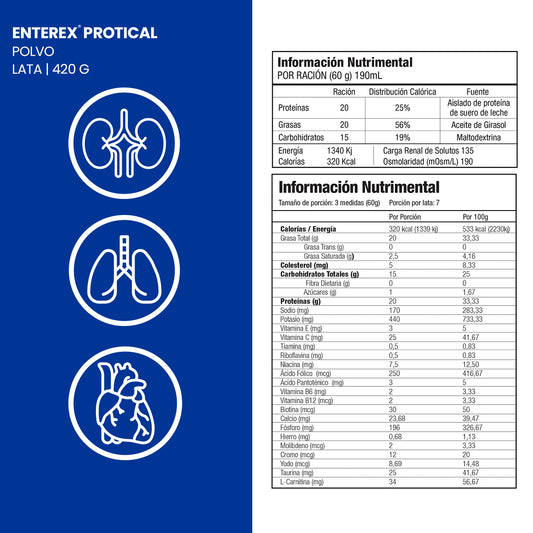 Enterex ProtiCal Polvo, caja con 12 latas de 420g. c/u, sabor Vainilla.